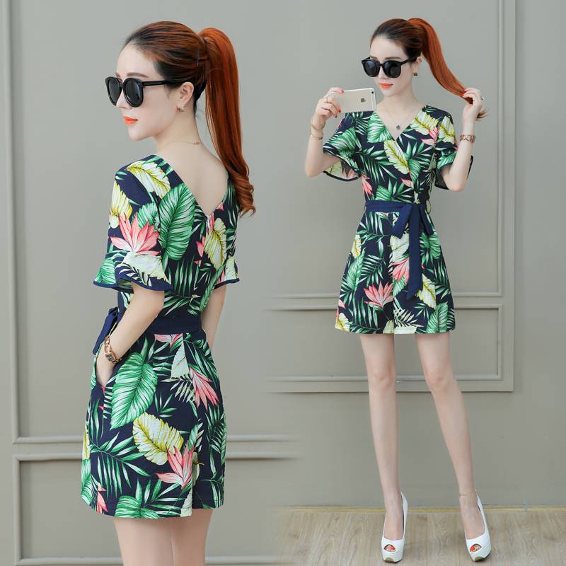 2018夏季新款韩版雪纺连体裤女装高腰显瘦阔腿裤短裤套装宽松裤子