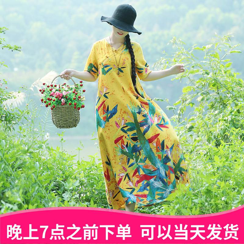 复古棉麻短袖长裙2018夏季新款民族风女装文艺盘扣印花大摆连衣裙