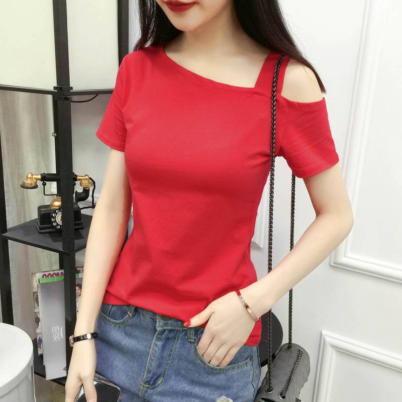 夏季新款纯棉短袖t恤女装潮韩版纯白色露肩女上衣修身半袖打底衫