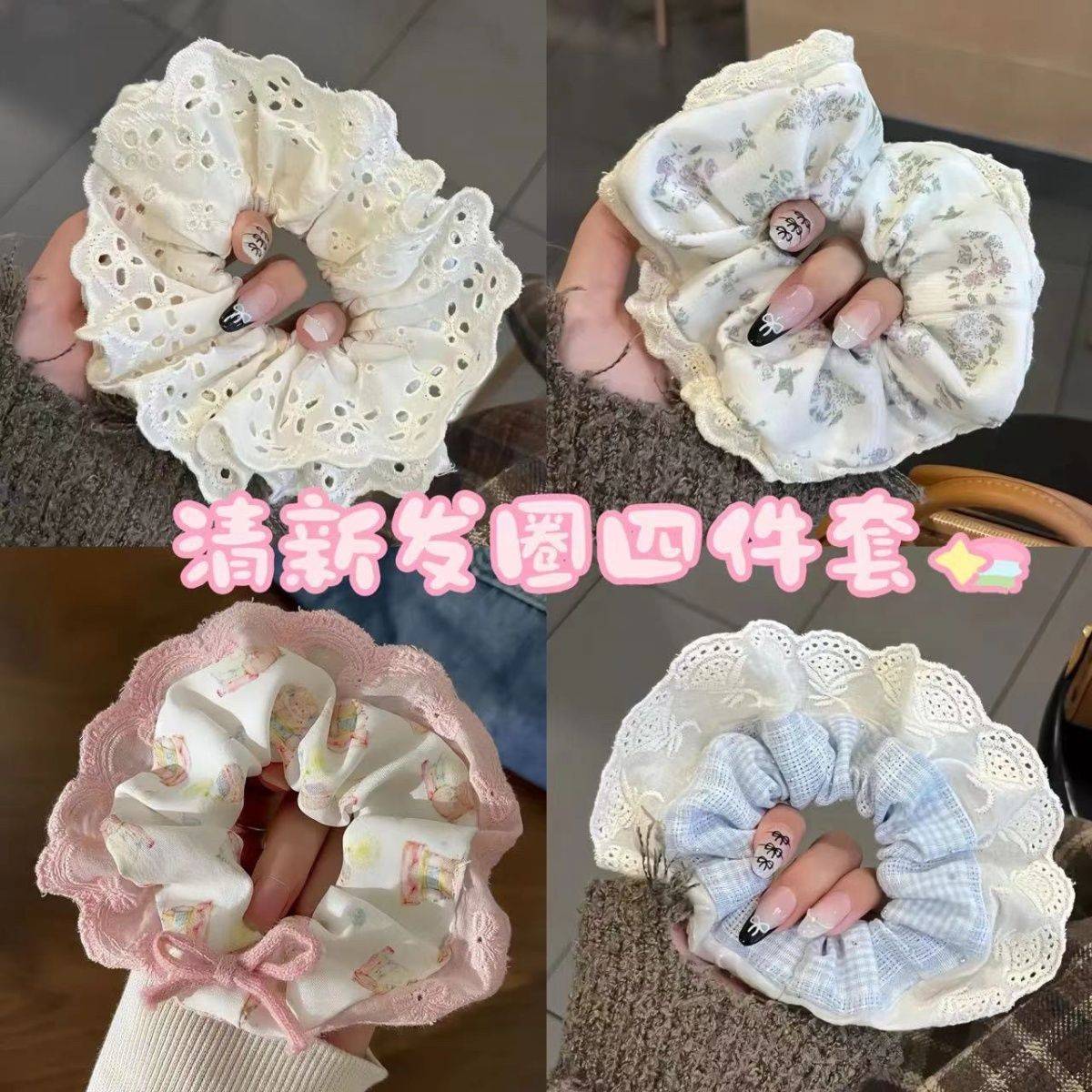 芭蕾风奶蓝格子重工烫钻蕾丝花边韩版大肠发圈可爱奶油甜妹发绳女