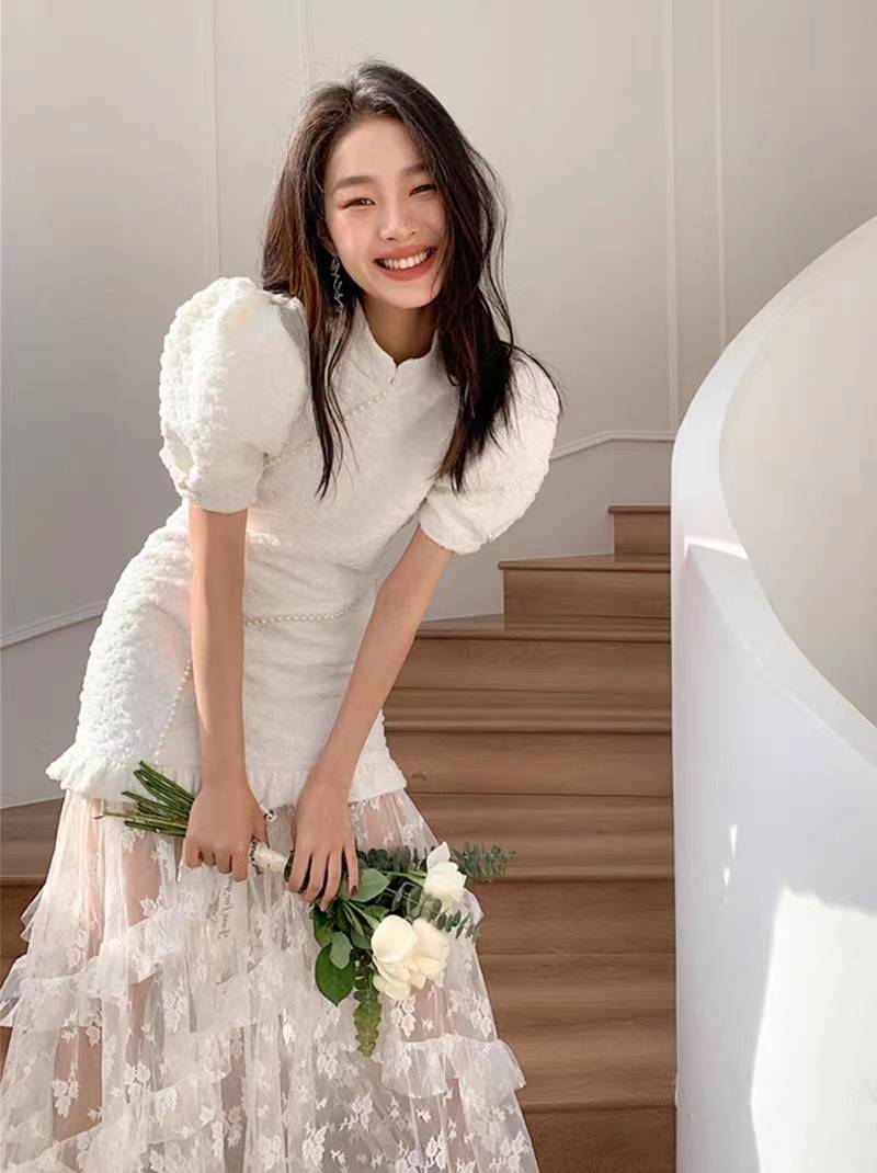 木兰新款白色珍珠装饰可拆卸蕾丝下摆连衣裙礼服