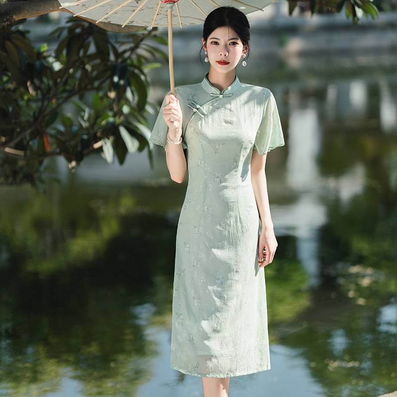 绿色旗袍新款2023小清新年轻款气质少女修身显瘦改良款连衣裙夏季
