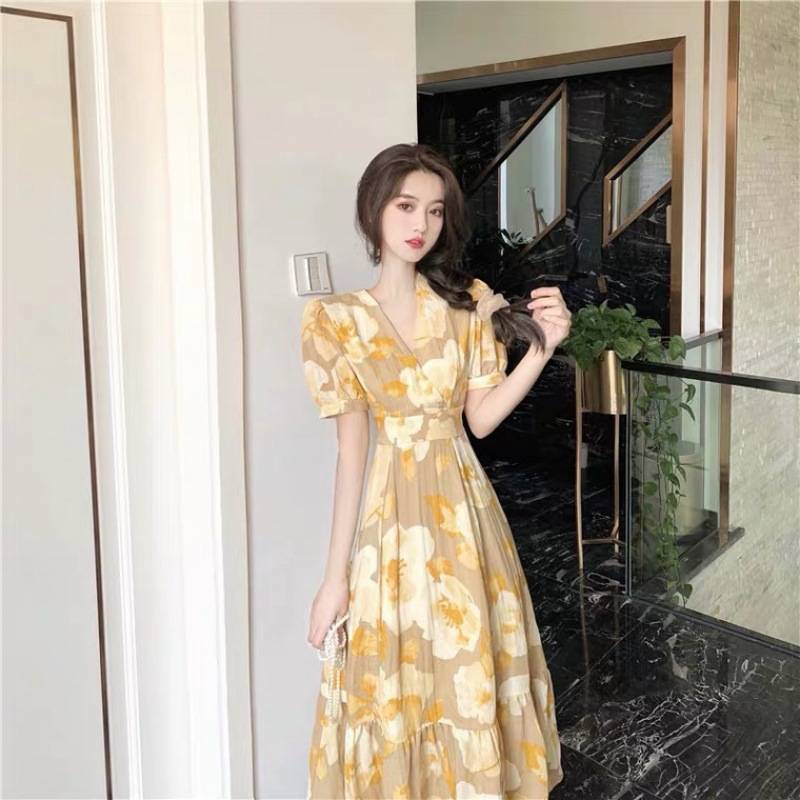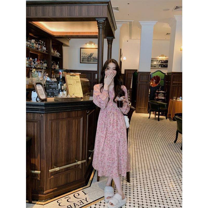 2023年夏新款赫本风可盐可甜长裙脚踝仙气森系甜美碎花连衣裙子女