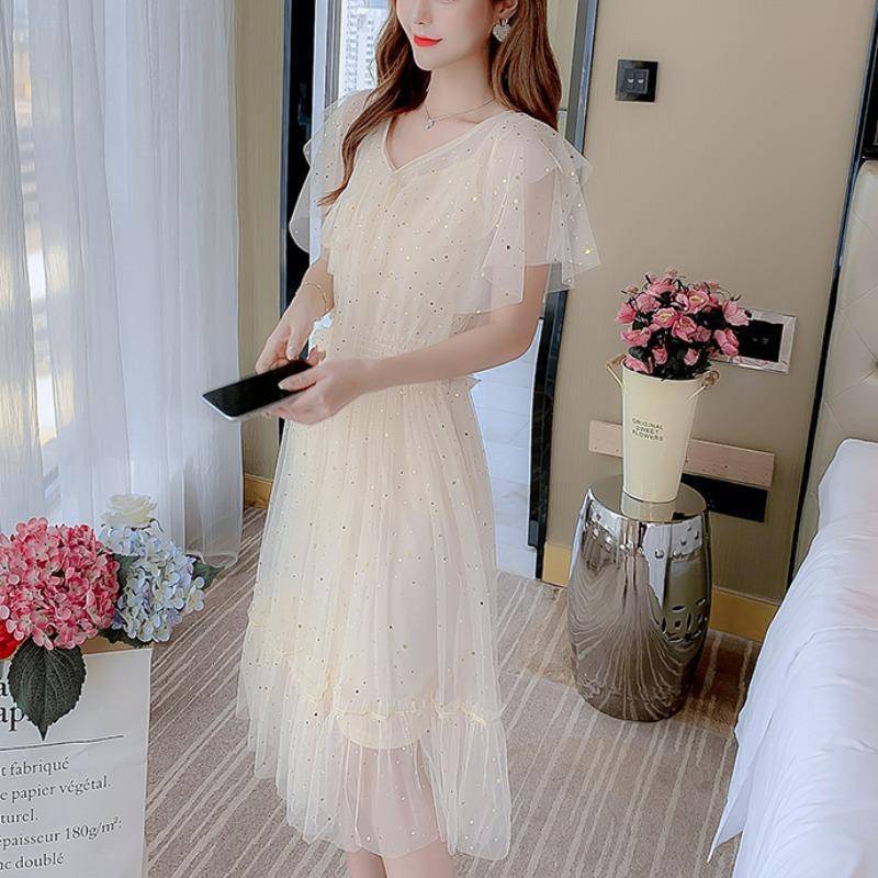 亮片网纱连衣裙女学生2023夏季新款法式仙女气质中长款短袖超仙裙