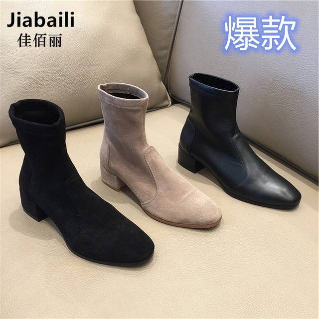 真皮方头粗跟短靴女春秋2019新款网红马丁袜靴中跟瘦瘦弹力靴子SW