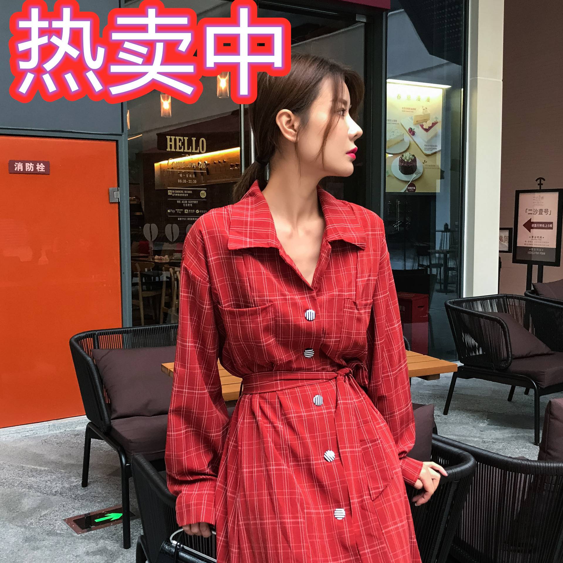 秋季外套女2019新款ins复古格子翻领系带收腰宽松过膝长款风衣
