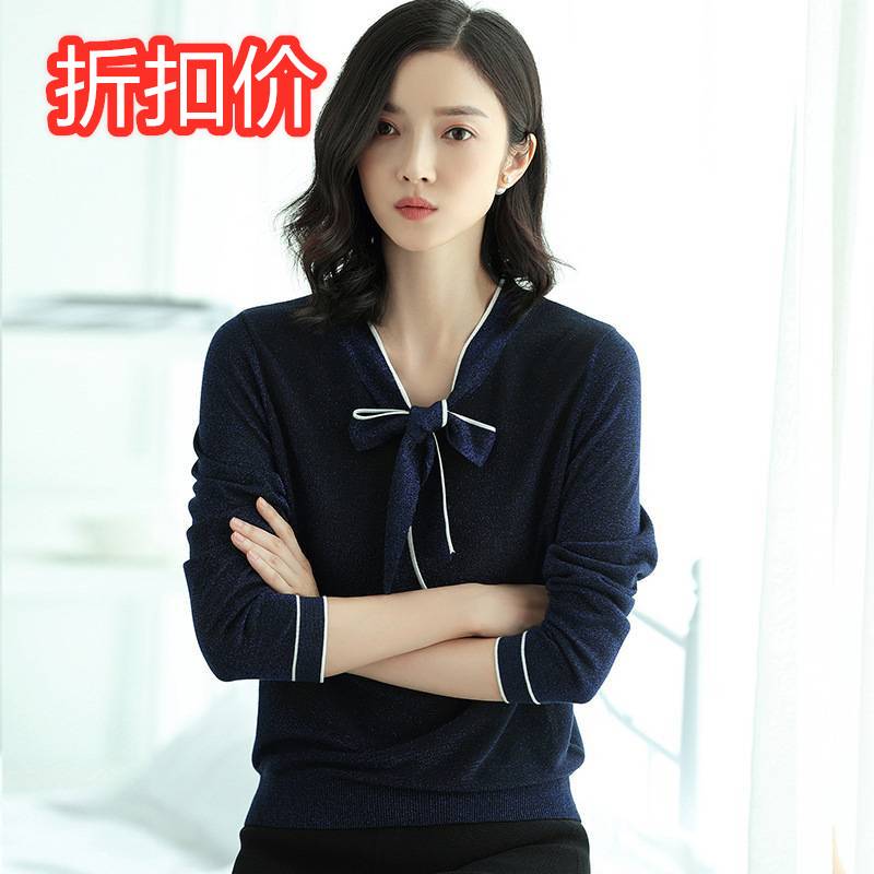 2019秋季新款优雅细腻 浪漫飘带V领撞色亮丝长款毛衣针织打底衫