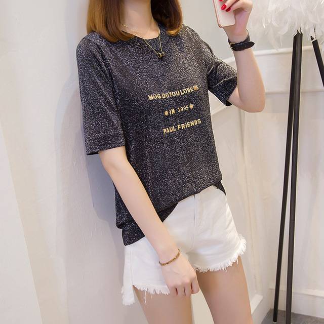 短袖t恤女2019夏装新款宽松韩版圆领亮丝半袖女士上衣女