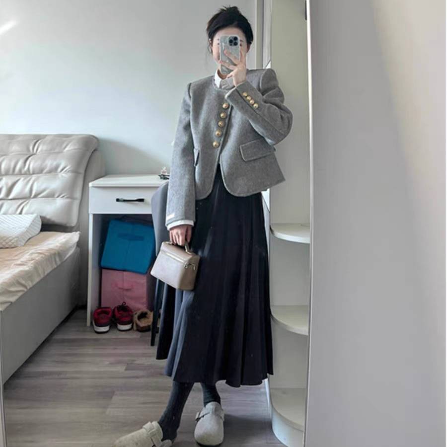 法式灰色小香风短款毛呢外套女冬季2024新款宽松小个子百搭厚大衣