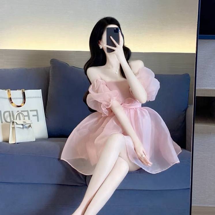 粉色连衣裙女夏2023新款法式气质收腰显瘦甜美a字公主蓬蓬裙纱网