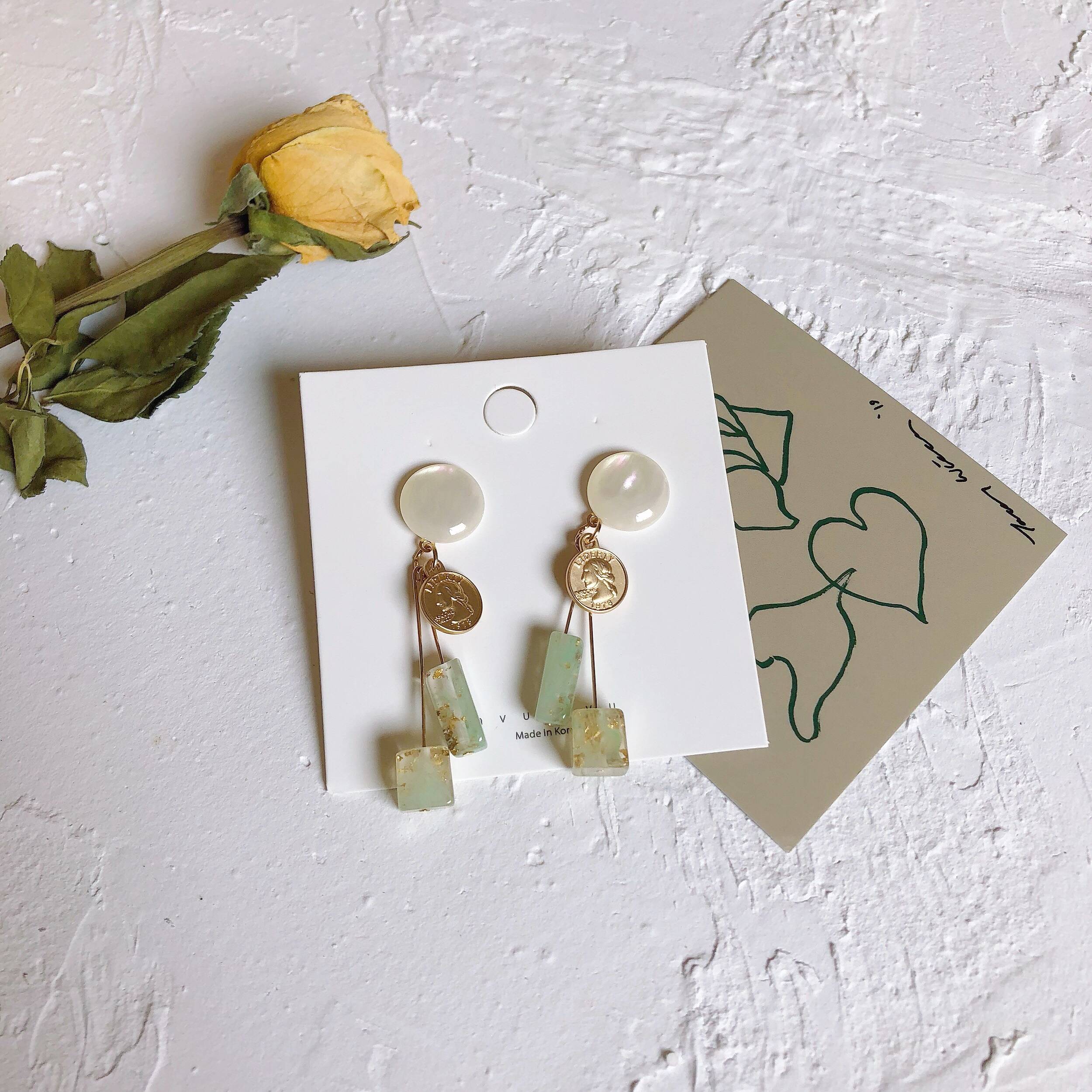 绿叶仙踪。芝木绿温柔气质金箔细闪果绿不规则耳钉韩国chic耳饰