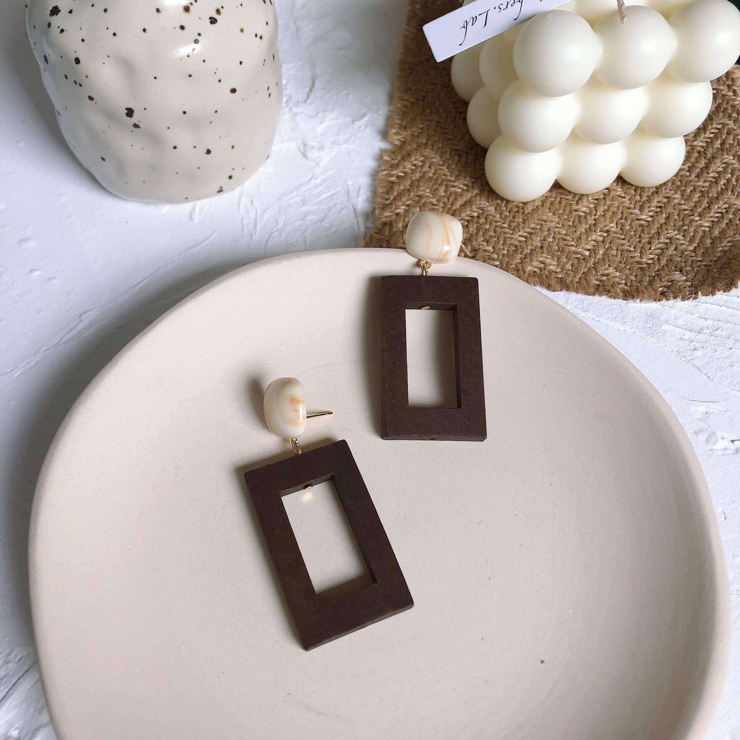 韩国ins秋冬新款 几何方形木质冷淡风耳环咖啡色小众简约气质耳饰