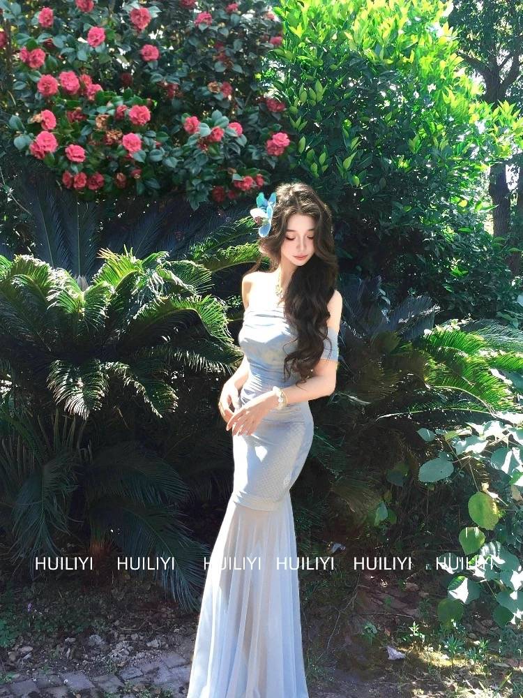 法式蓝色印花网纱一字肩连衣裙女夏季海边度假修身收腰包臀长裙子