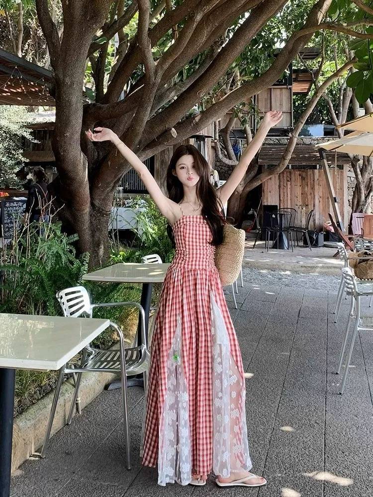 设计感重工蕾丝拼接格子吊带连衣裙2025夏季新款显瘦A字长裙女潮