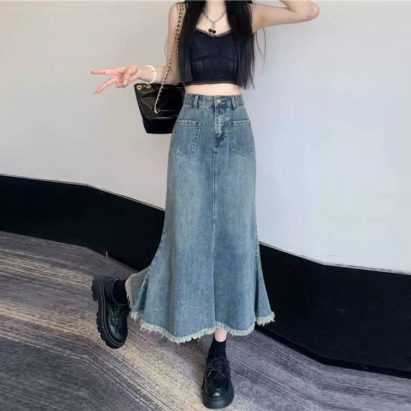 毛边牛仔鱼尾裙女设计感半身裙高腰百搭a字遮肉复古包臀中长裙子