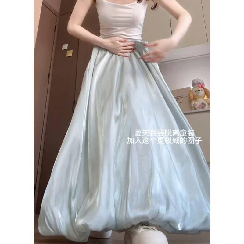 流光纱半身裙女夏季薄款高级感小个子高腰垂感a字蓝色蓬蓬花苞裙