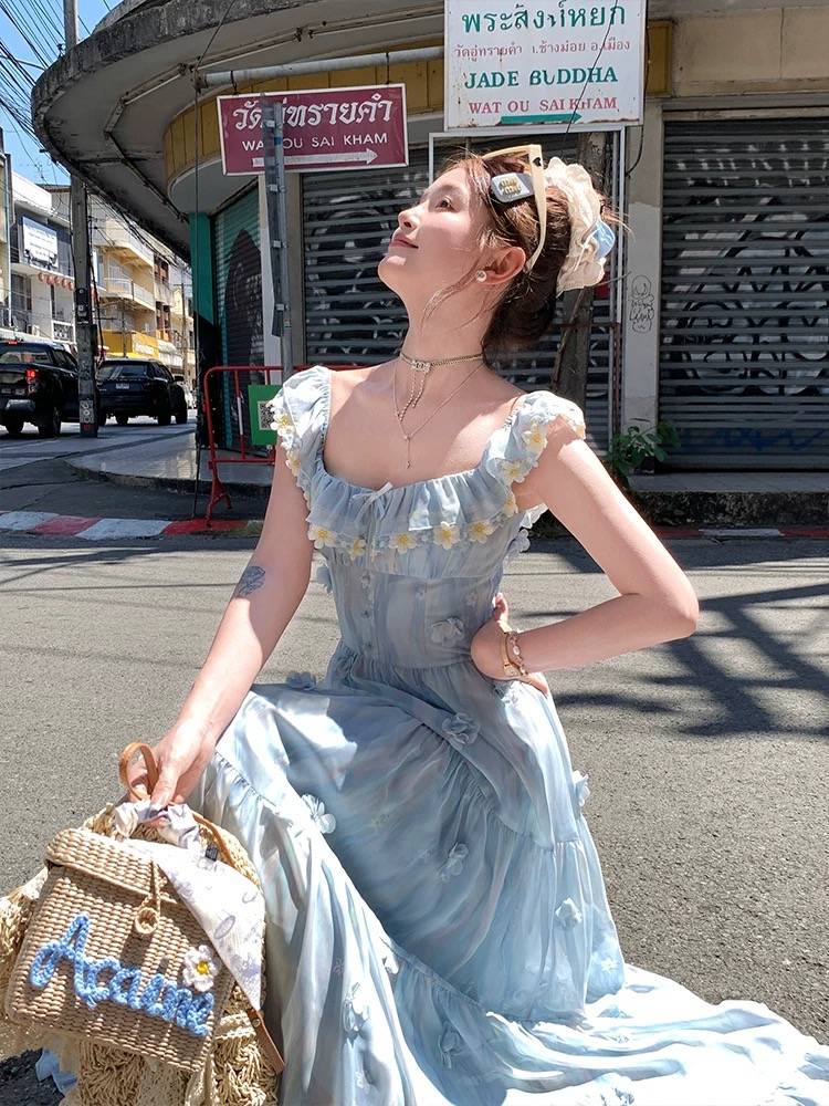 Acaine蓝色长款雪纺印花小飞袖吊带连衣裙女夏季法式甜美显瘦裙子