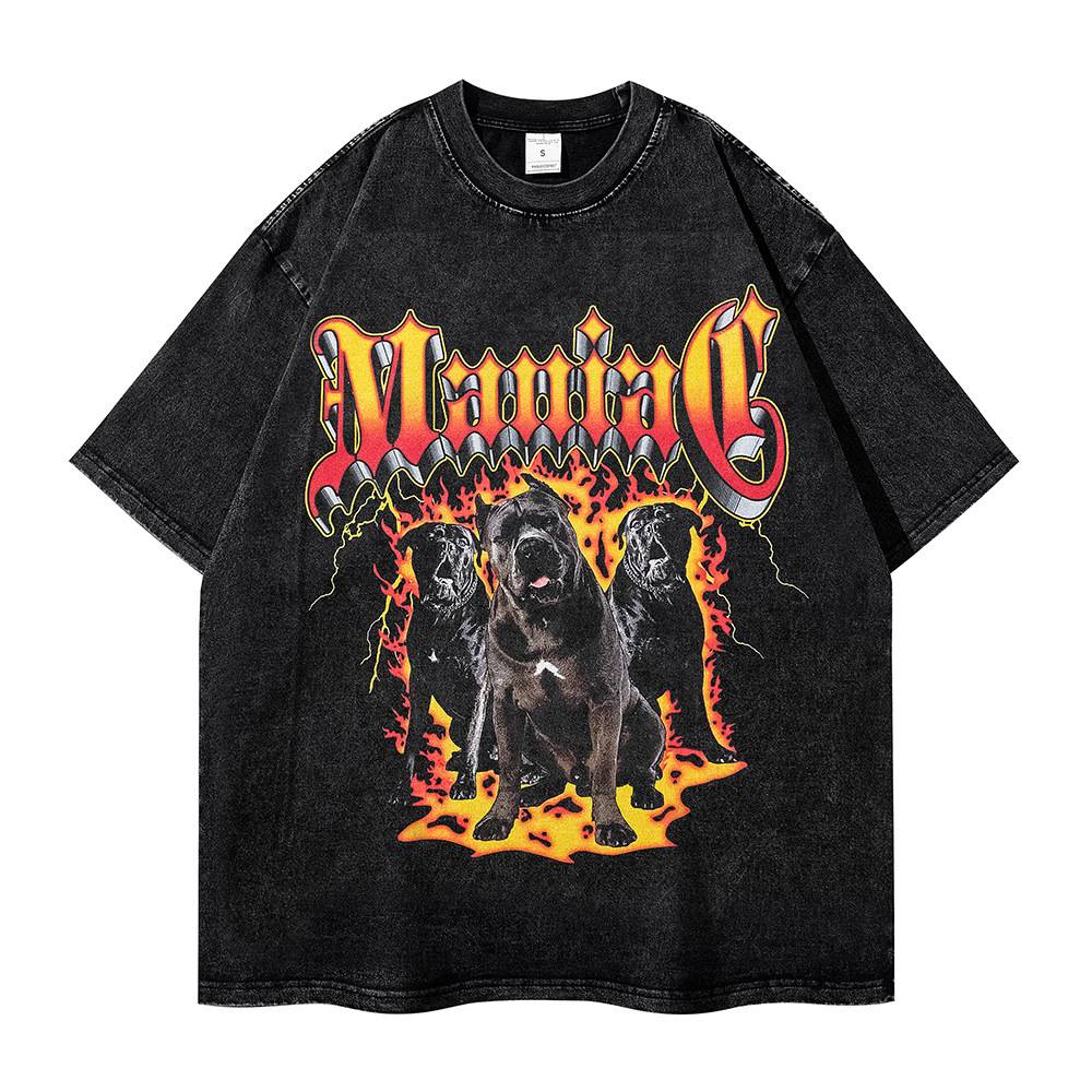 国潮春季新品复古洗水做旧地狱犬印花宽松短袖T恤男士情侣跨境