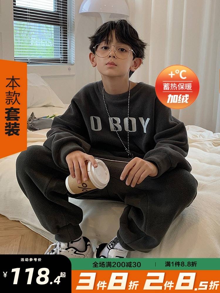 2022新款男童套装卫衣裤子潮牌童装秋冬装摇粒绒儿童加宽两件套男大童加厚