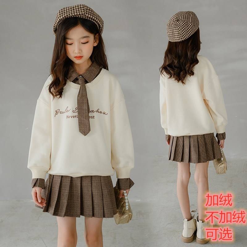 2022秋冬女童卫衣短裙套装加绒女孩学院儿童百褶裙两件套洋气加厚