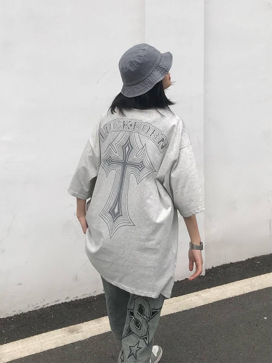 FAK刀刀国潮街头基础百搭十字架印花半袖T恤男街头宽松简约短袖女