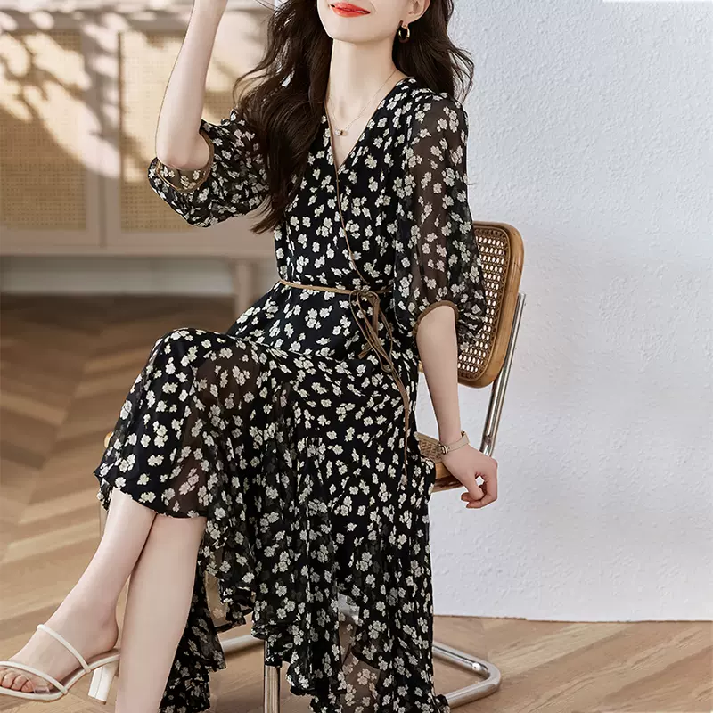 碎花雪纺连衣裙子女士装夏季2023年新款收腰七分袖妈妈气质中长裙