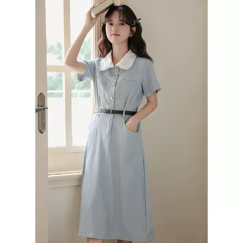 法式高级感蓝色娃娃领连衣裙女装夏季2023新款小个子收腰气质裙子