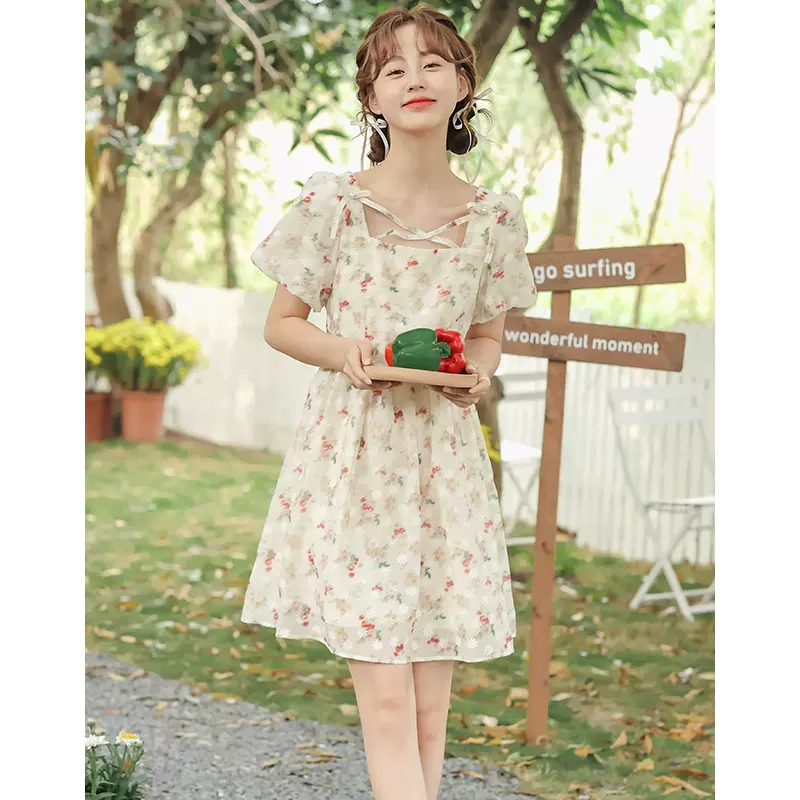 法式复古甜美碎花连衣裙女装夏季2023新款泡泡袖初恋清纯奶甜裙子