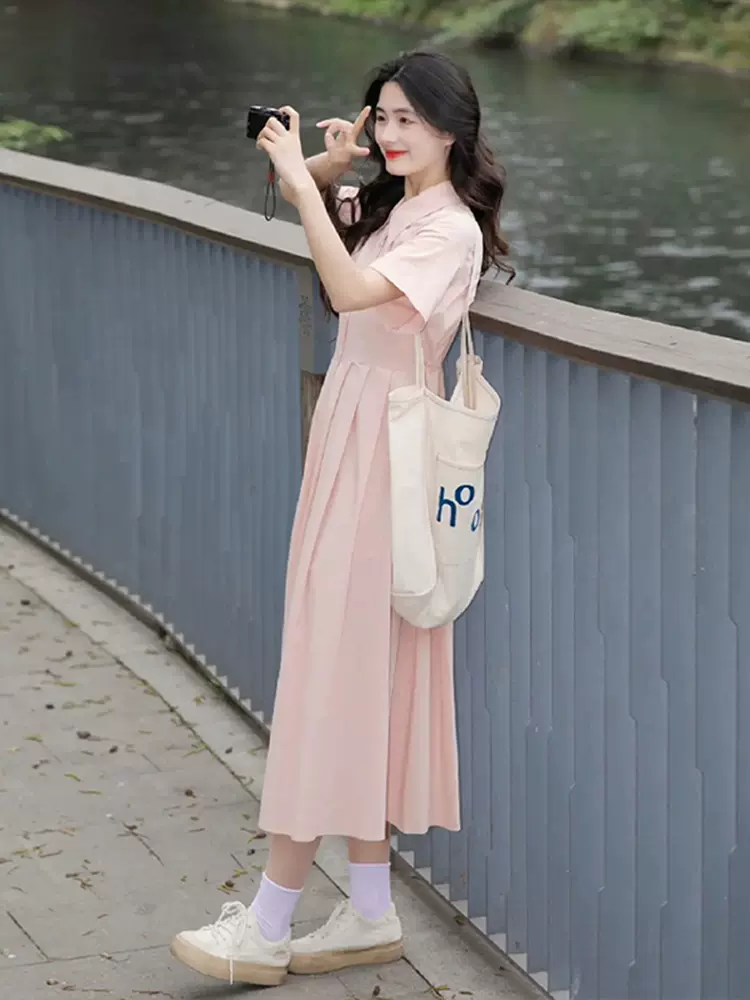 高级感气质收腰衬衫连衣裙子女2023新款夏季学院风polo领仙女长裙