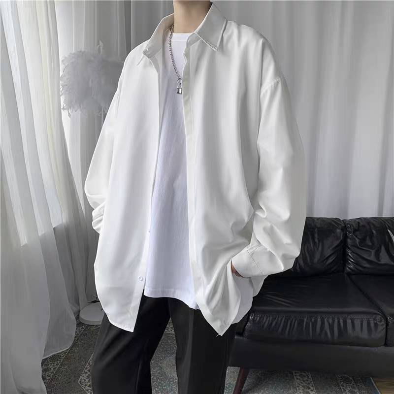衬衫男士春秋新款外套高级垂感长袖宽松冰丝潮流夏季薄款黑色衬衣
