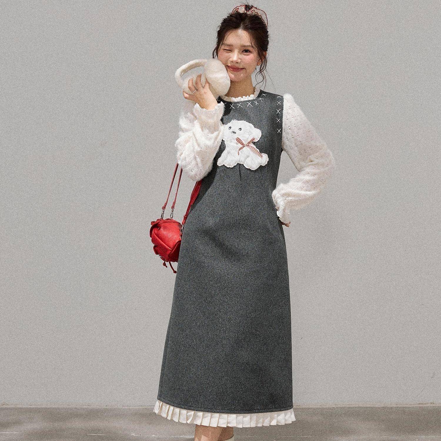 微胖mm【复古旋律】灰色小狗呢子马甲假两件连衣裙甜美减龄裙子