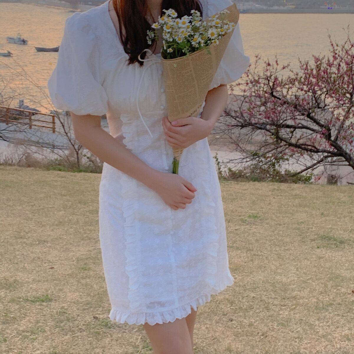 法国小众桔梗裙子女2020夏装新款气质V领单排扣雪纺短袖连衣裙女