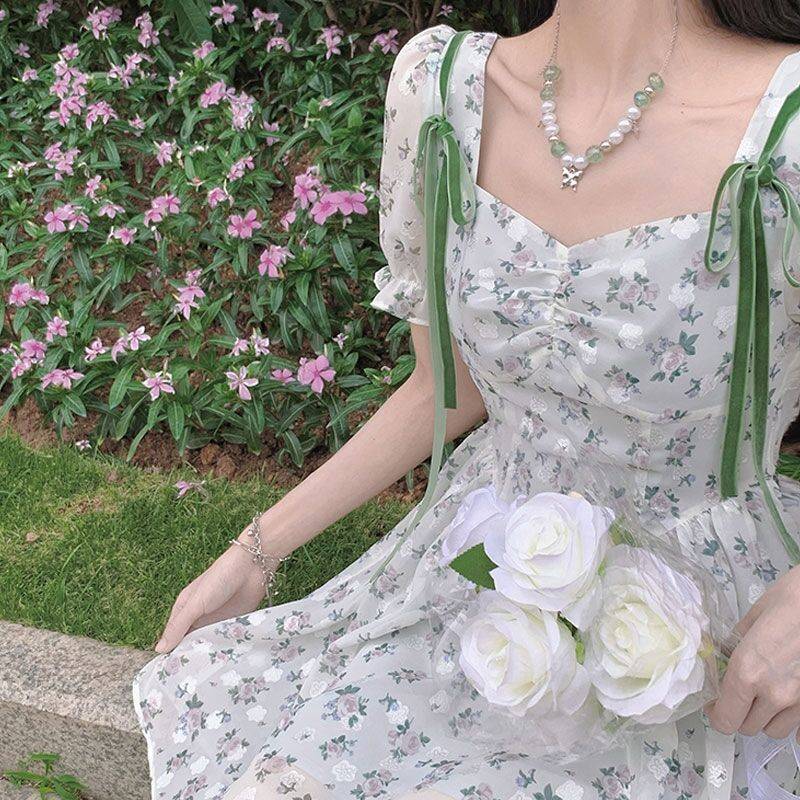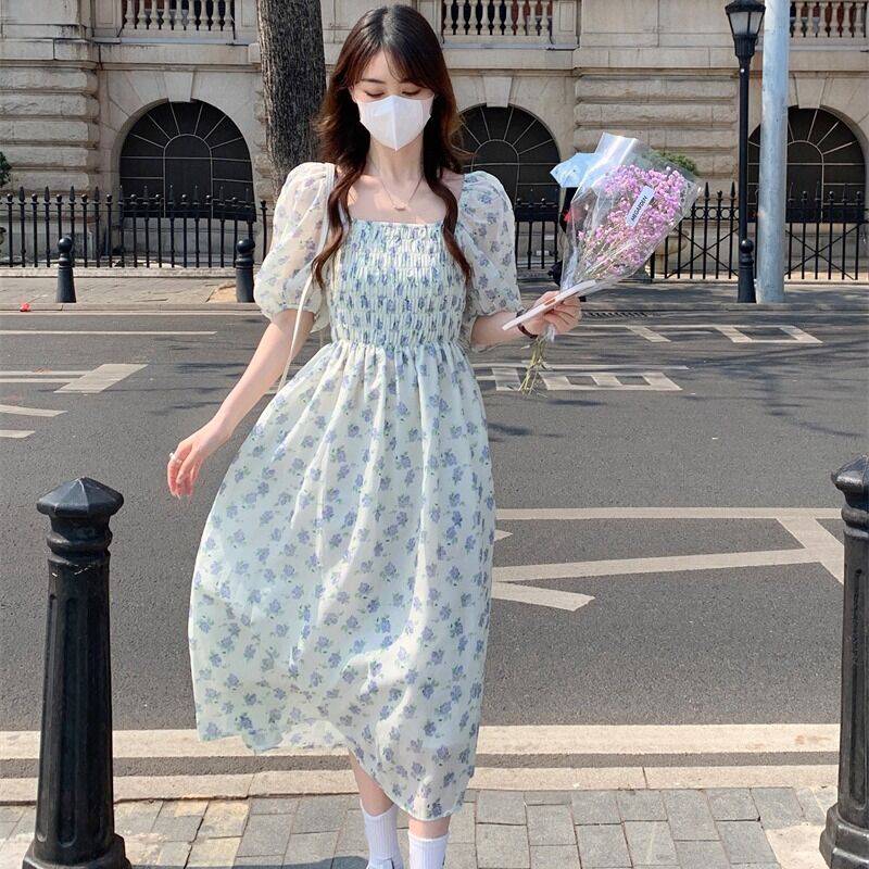 法式复古时尚连衣裙2020夏季新款女装气质百搭收腰显瘦印花裙子女