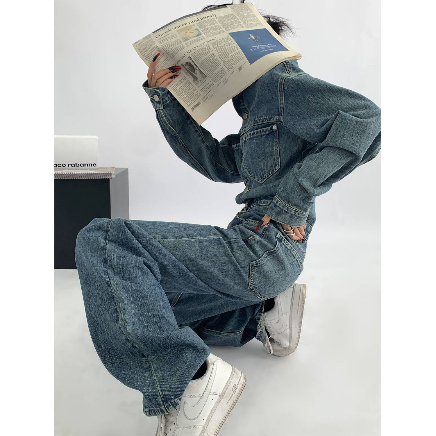 洗水做旧 复古连体牛仔连体衣女2022秋宽松