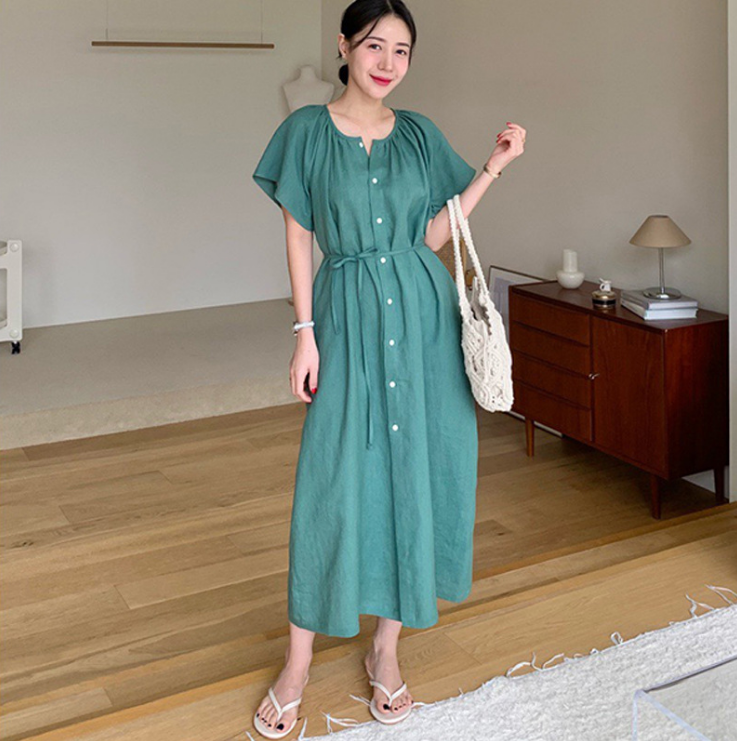 2023年夏季新款韩国气质甜美圆领系带收腰显瘦长款连衣裙