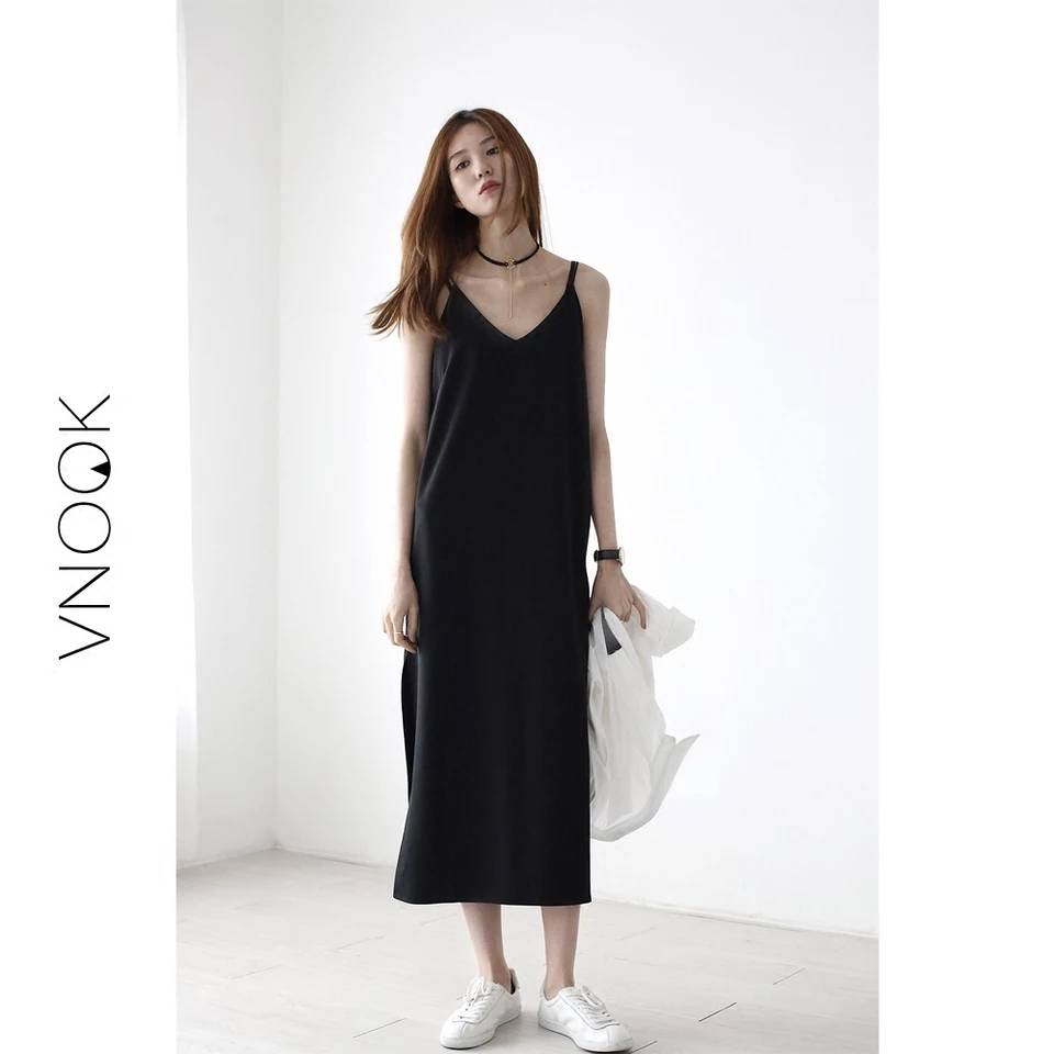 VNOOK春夏新款 质感纯色中长款直筒显瘦V领侧开衩吊带连衣裙 女