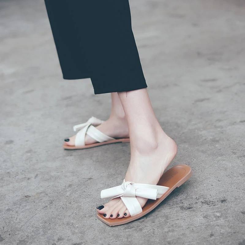 凉拖女夏季平底鞋2018韩版新款蝴蝶结休闲懒人软底沙滩鞋外穿拖鞋