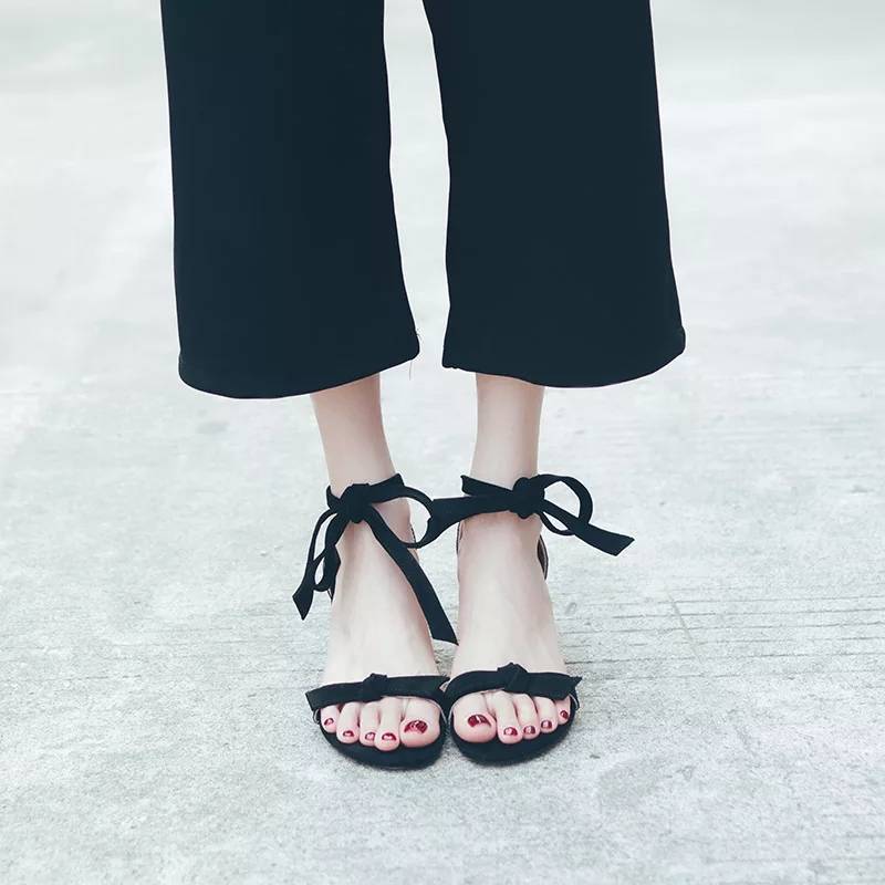 一字粗跟凉鞋2018新款女夏季系带蝴蝶结小清新凉鞋露趾仙女高跟鞋