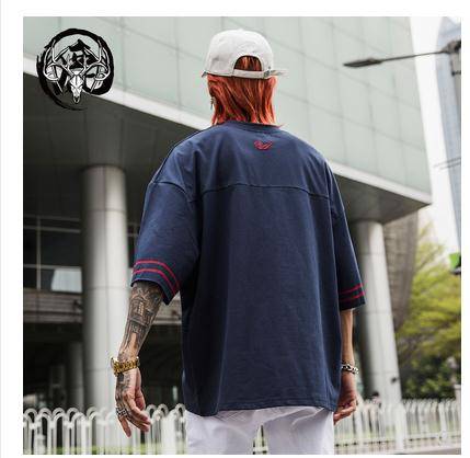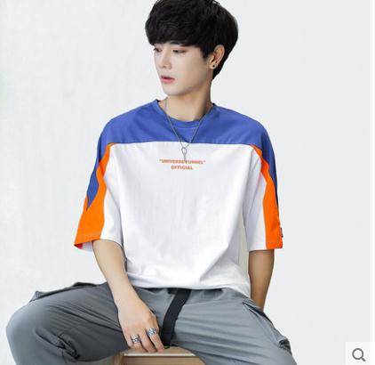夏季韩版日系短袖t恤男学生ins超火圆领拼接半袖青少年五分袖潮丅