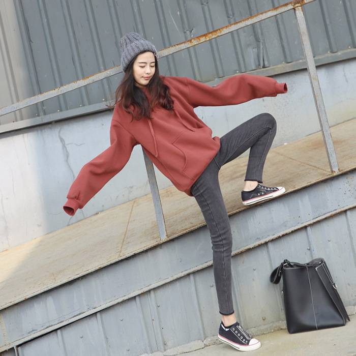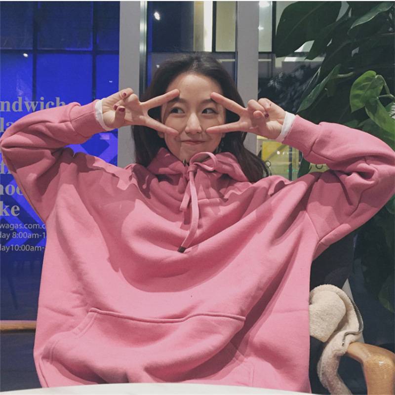 2018秋冬款新品宽松大码套头长袖外套抓绒加厚纯色连帽学生卫衣女