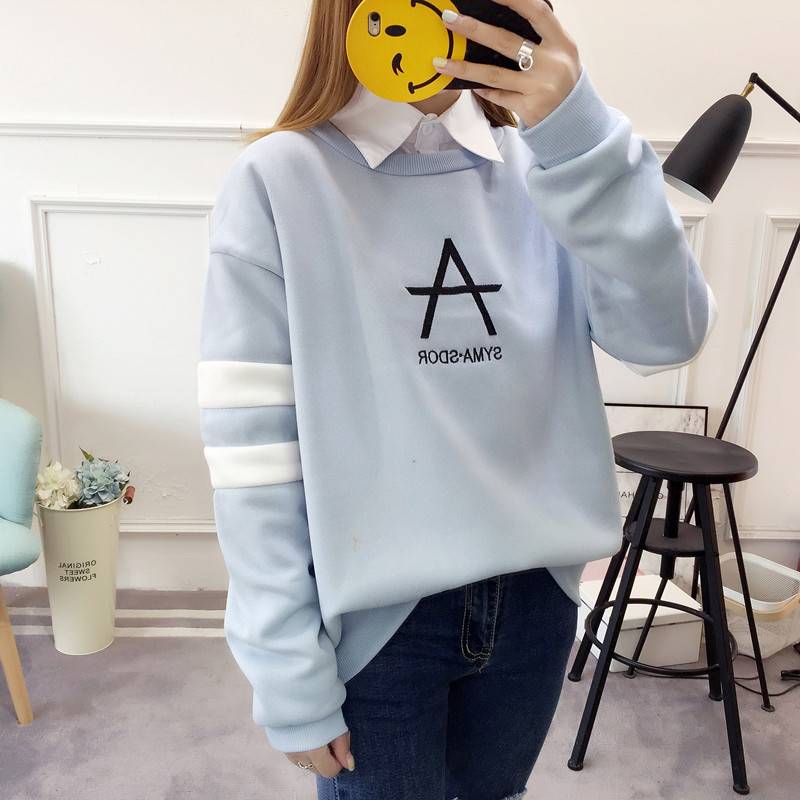 实拍2018春季韩版简约学院风百搭连帽抽绳白边假两件加绒卫衣女装