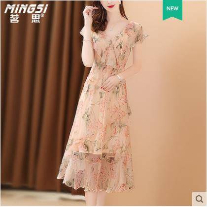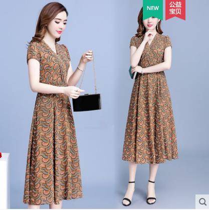雪纺连衣裙女夏2018新款时尚女装修身显瘦印花V领短袖中长款A字裙