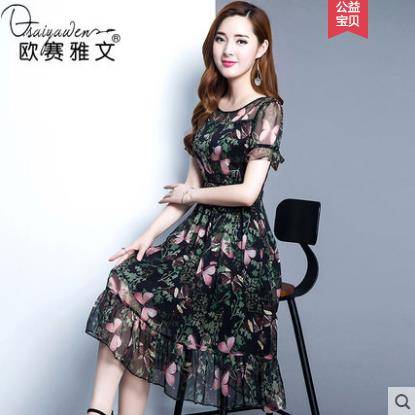 2018夏装新款韩版时尚荷叶袖印花裙中长款高腰显瘦短袖雪纺连衣裙