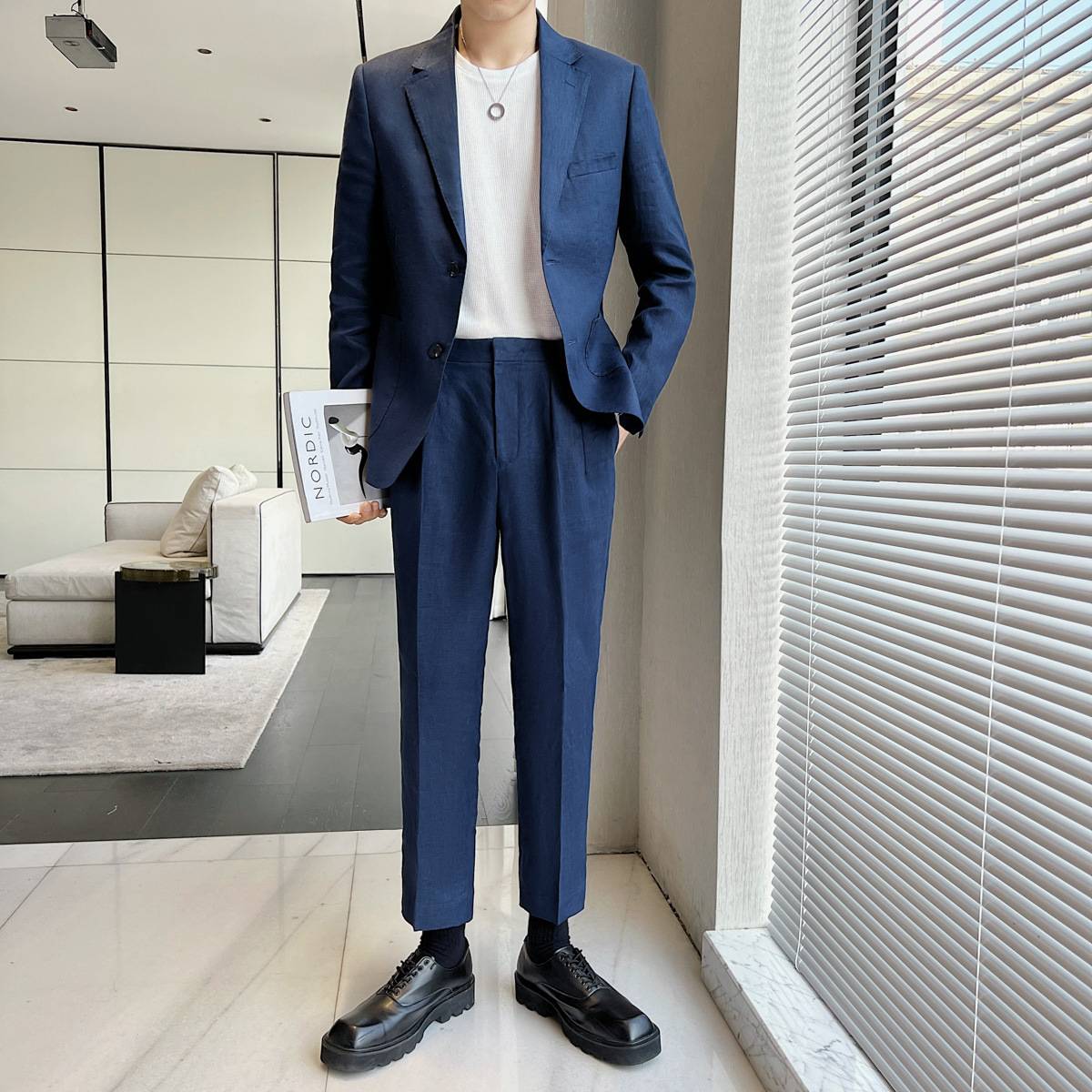2022春夏新品男士休闲西装韩版时尚修身棉麻西装套装清爽舒适西服