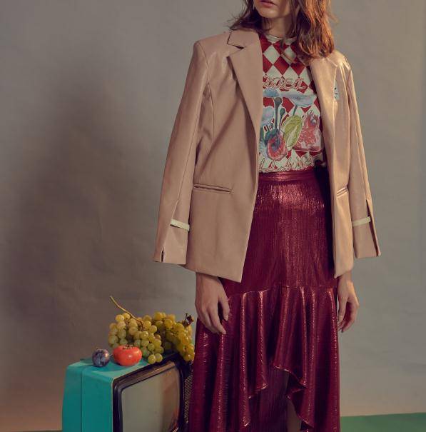 粉色文化标小宽肩皮西装WANGREENxCHENCLEAN原创设计师WXC