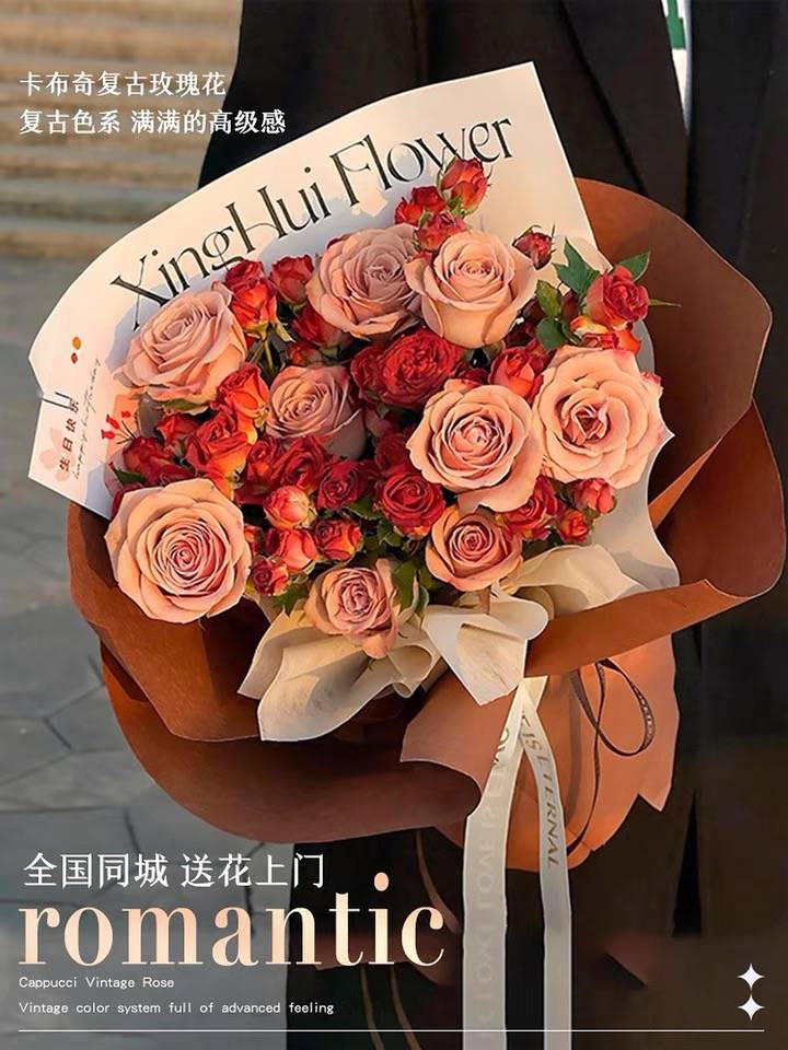 全国卡布奇诺复古玫瑰花束鲜花速递同城广州上海深圳北京生日配送