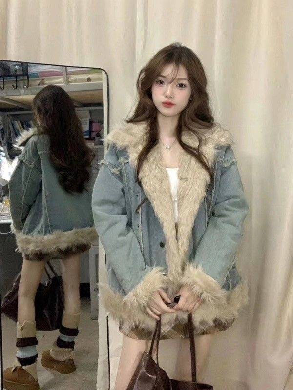 韩系小个子学院风牛仔拼接毛毛外套女秋冬高级感夹棉加厚棉衣棉服