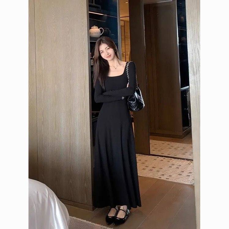 SODAZZZ 方领黑色连衣裙女长袖2023秋季打底裙收腰显瘦a字长裙