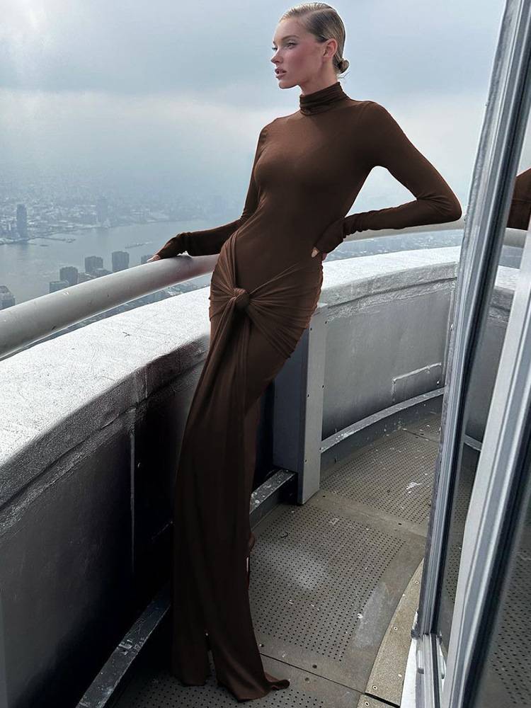 法式热销欧美新款纯色秋冬高领长袖时尚拼接绑带长款修身连衣裙女