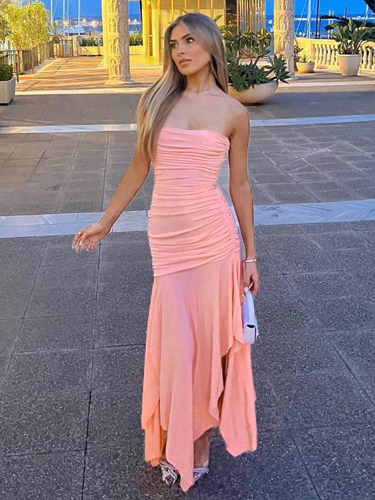 欧美风新款纯色吊带拼接花束装饰修身御姐风开叉褶皱连衣裙女代发